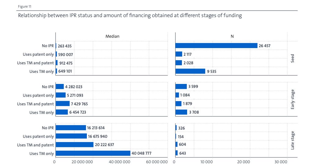 Why does this occur? There are likely a few reasons. If you ask companies themselves, a survey found that the top reasons companies believe their IP is valuable is generating revenue and defensive use. The EPO also observes that there is a significant literature indicating that IP also serves a signaling function: that is, if your company has its act together enough to file for IP and have a coherent strategy, that likely says something about other unobservable factors. Signaling likely also likely helps explain why European patent applications4 provide a bigger boost than national patents at every stage of the analysis. This is likely in part due to signaling too, since it implies a bigger ambition. But in our view, the EPO underplays the explanatory power of the hard benefits of patents. A European application has broader potential protection than a national patent, allowing the startup to target a bigger market. And IP represents an asset that can be licensed for additional cash flow or sold in the event of bankruptcy. The first allows startups to boost their cash flow in a non dilutive fashion while the second provides risk protection, which startups often lack. That said, though the study offers many guesses as to the causal mechanisms, the data isn’t rich enough to prove any of them.