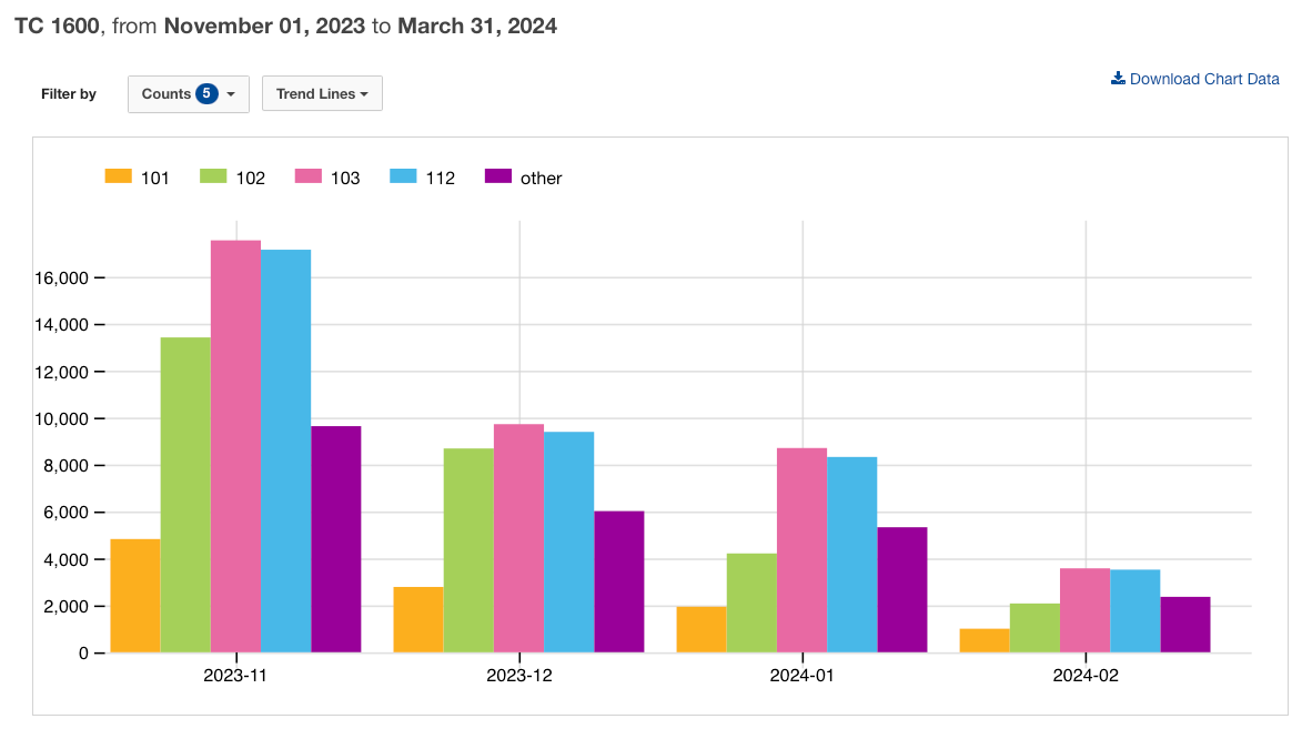 But there is another, large category called “other.” The amount of “other” rejections varies quite a lot by Tech Center. In TC 1600 (Biotechnology and Organic Chemistry), 43% of all patents have an “other” rejection. In TC 2800 (Semiconductors/Memory, Circuits/Measuring and Testing, Optics/Photocopying, Printing/Measuring and Testing), it is only 16%. Across the entire patent corps, 19% of all patents had an “other” rejection—as many as 101 rejections. This distribution has been relatively stable over time, but is trending slightly upwards. Below, for example, you can see the data for the past few months in TC 1600.